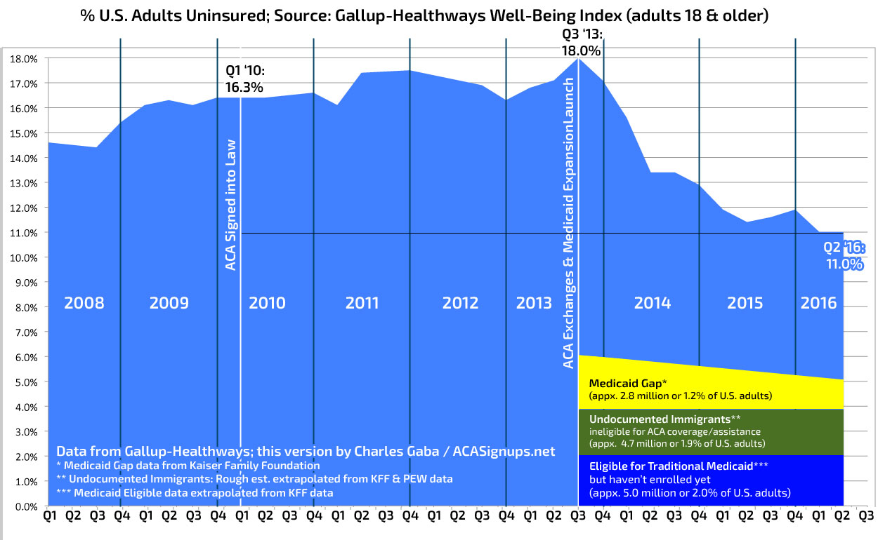 As I do every three months, I'm reformatting their data in a more relevant format, since Gallup seems to be determined not to show the full Y-axis on their graphs (see bottom of entry for original). In addition, I've added some other key data points: Q1 2010 (when the ACA was actually signed into law) and Q3 2013 (when the ACA exchanges and Medicaid Expansion programs launched). Finally, I've added 3 color-coded sections, showing three major categories of the uninsured: Adults who are already eligible for Medicaid but haven't actually enrolled in the program yet; undocumented immigrants who aren't eligible for any taxpayer-funded coverage (or even for full-price exchange-based policies); and the 2.8 million people still caught in the "Medicaid Gap" across 19 states which haven't expanded the program yet. Note that the Medicaid Gap has shrunk from around 5 million in 2014 as a half-dozen or so states have come around; the other two groups may have gone up or down since 2014.