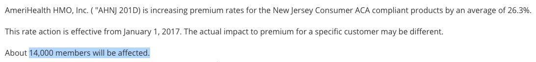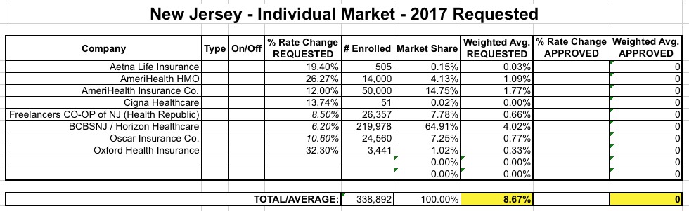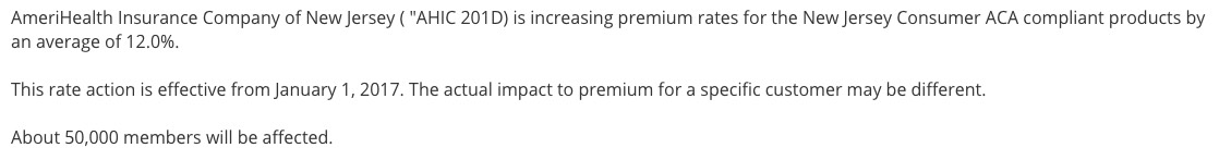 Yes, that's right...New Jersey appears to be among the very few states requesting average rate hikes of below 10% for 2017. This is mainly due to Horizon/BCBSNJ, which, unlike most other major carriers around the country is only asking for around a 6.2% average rate hike (again, this is a rough average based on the 4 filings below):