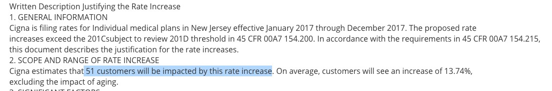 Unfortunately, several of the carrier filings, including those of the Health Republic Co-Op (Freelancers), Horizon Healthcare (BCBSNJ) and Oscar Insurance are redacted, making it very difficult to track down the enrollment numbers. In addition, all three of these carriers broke their plans out into multiple filings (one for Gold, one for Bronze, etc), meaning I can't even get a hard average rate request; I had to make an educated guess by averaging the individual percentages (for instance, there are usually very few people enrolled in Catastrophic plans, so I didn't give much weight to those filings).