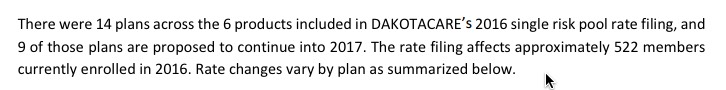 Only 4 carriers appear to be participating in the ACA-compliant individual market in South Dakota next year: Aetna, Sanfrod, SD State Medical and Welmark. I only have the enrollment numbers for 3 of the 4, but the requested rate hike for the fourth one (Sanford) is pretty close to the average of the other three anyway, so it shouldn't really impact the overall average by much: