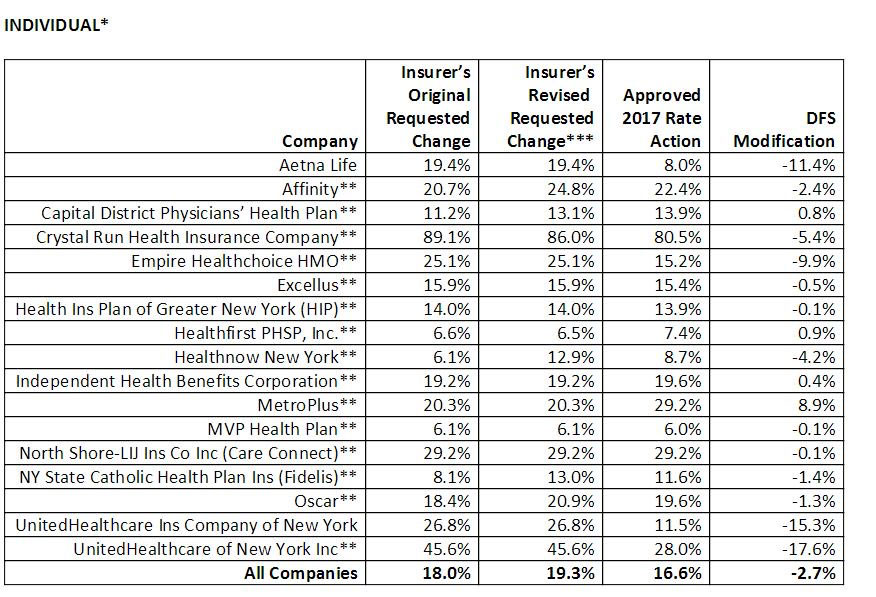 DEPARTMENT OF FINANCIAL SERVICES ANNOUNCES 2017 HEALTH INSURANCE RATES