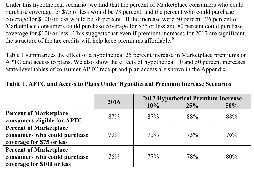 Thus, it's not surprising at all that an hour or so ago they released a new report which reminds people that nearly 4/5 of current ACA exchange enrollees will still be able to find an exchange-based Qualified Health Plan for $100 or less per month (and 3/4 could find one for $75 or less per month) after applying APTC assistance in the event of an across-the-board 25% premium rate increase in 2017:
