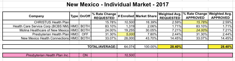 New Mexico: *Approved* avg. 2017 rate hikes: 28.4% (w/caveat)