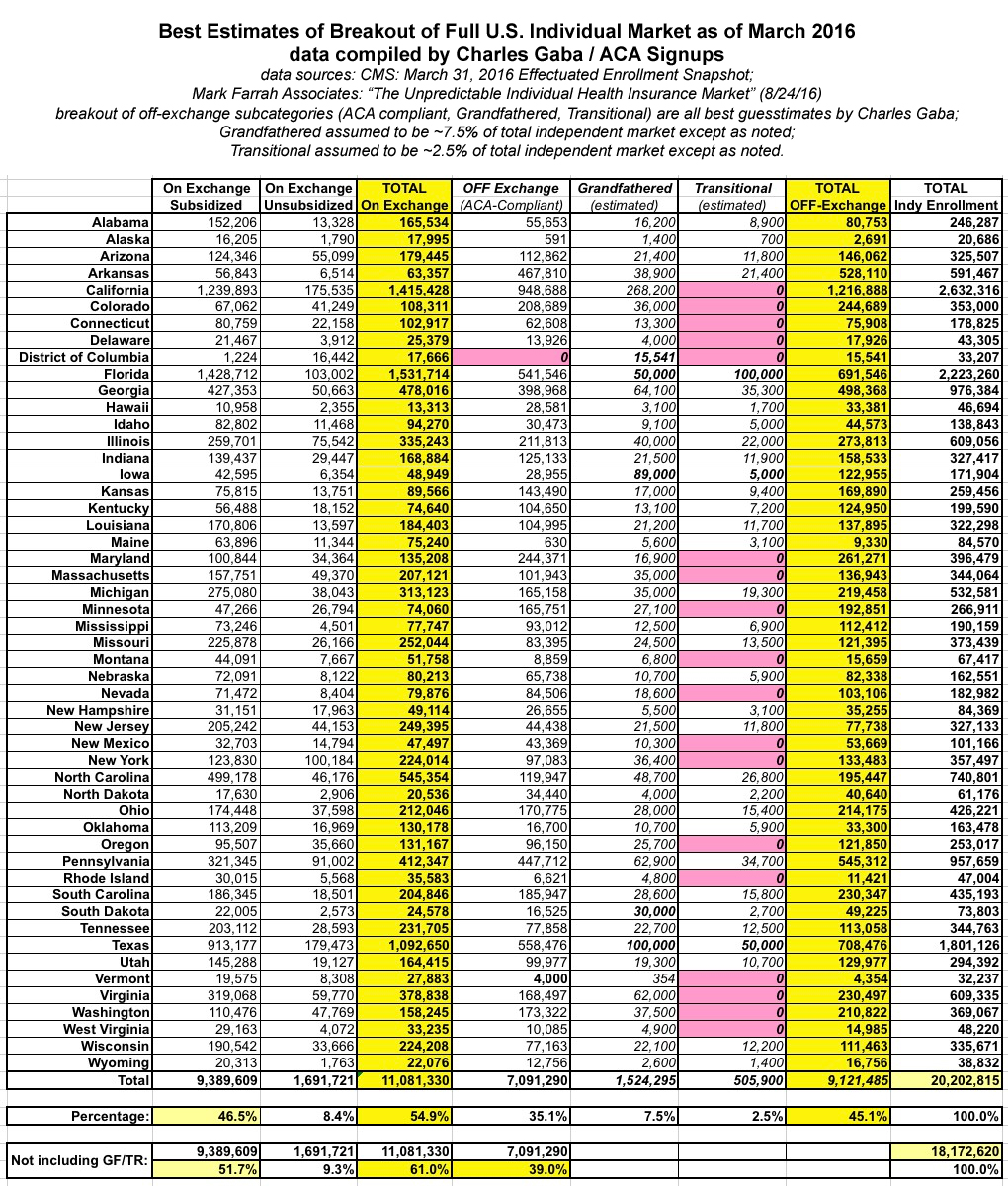 It's important to note that in the states where there's no Grandfathered/Transitional (GR/TR) numbers listed, some chunk of the "Off Exchange Unsubsidized" tally likely belongs in the GR/TR column. Even so, the above hard data is remarkably close to my own assumptions: