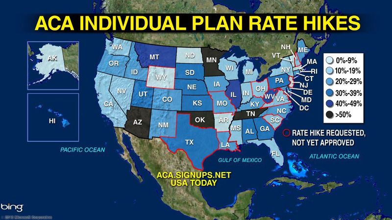 Premiums have skyrocketed across the nation, with a national average of almost 25%, with some states experiencing rate increases up to 70%. In Iowa, one plan got a 43% increase approved. In Florida, the individual market will see an average rate increase of 19%. In Pennsylvania, at least three plans requested rate increases over 40%. And the average rate requested in Minnesota is 54%. [ACA Signups], [Health Insurance], [Miami Herald], [Health Insurance]