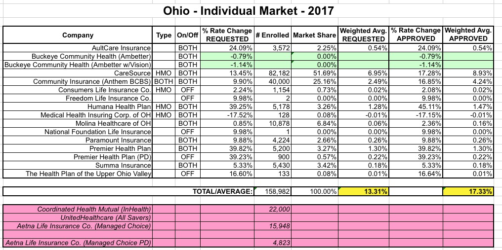 - OHIO: This is another of the 5 missing "approved" states. Unfortunately, there's one key number missing from my Ohio spreadsheet: I have no idea how many people are actually enrolled in Buckeye Community Health plans. This is important because unlike most carriers, Buckeye not only requested rate reductions, they actually received them. If a large number of Ohio residents are enrolled in Buckeye plans, that could lower the statewide weighted average significantly.