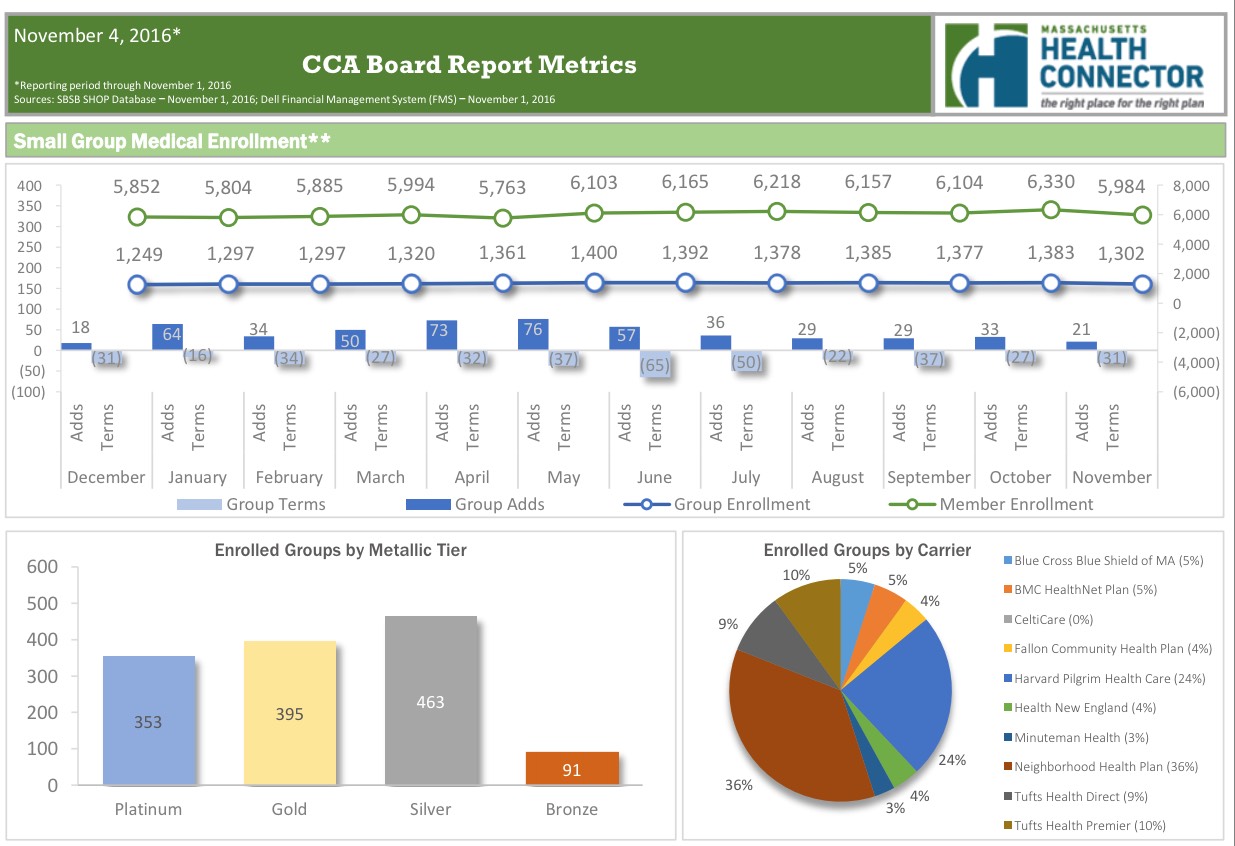 According to the dashboard report, as of November 2nd, the MA Health Connector had 233,536 people enrolled in effectuated policies, or 12.8% more than they had at the end of March.