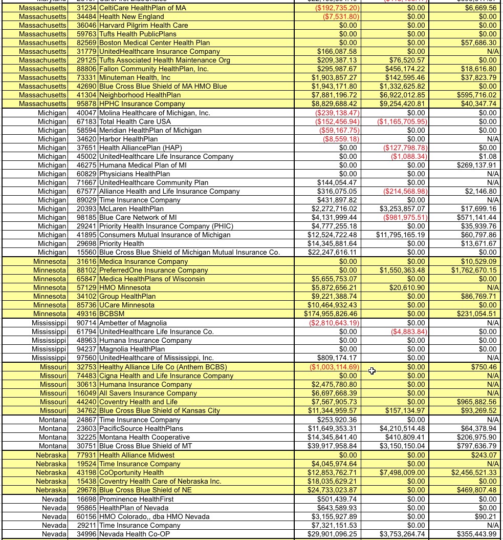 A table follows, listing every carrier across the country which owes money to or is owed money from the Risk Corridor program for 2015, as well as how much 2015 funding will be paid out to them to cover what's still owed for 2014. It's a long list, and some of the numbers are pretty big.