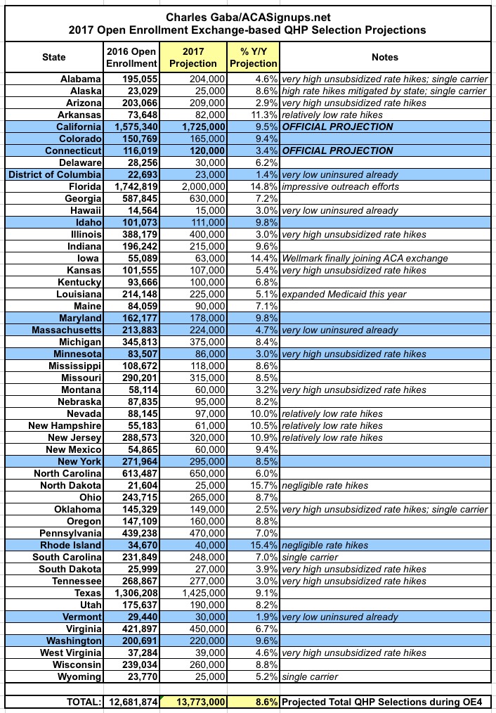 There's no great trick to my methodology. My national projection (13.5 - 14.0 million) lines up almost perfectly with the HHS Dept. this year (13.8 million), so that's where I started...assuming a national QHP selection bump of around 8.7% over last year (13.8 million vs. 12.7 million). I tacked 8.7% onto each state's OE3 total to get a baseline projection.
