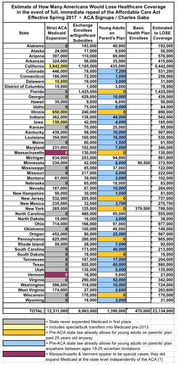 Earlier today I posted fully broken-down estimates of just how many people would be directly impacted by a full & repeal of the Affordable Care Act this spring, assuming that the repeal took immediate effect and there was no replacement plan in place for the various provisions of the law.