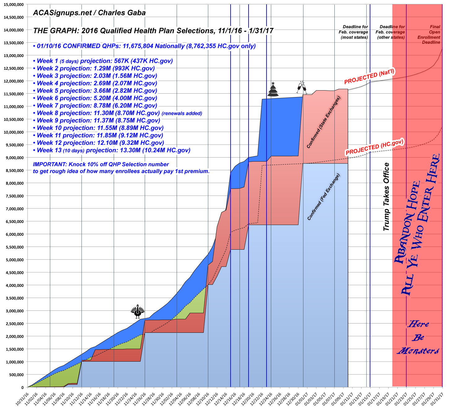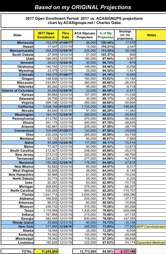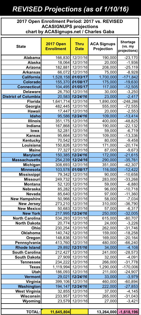 The problem is that there's another 28 states which are below the 87% threshold, including some big ones like Texas and Florida. Every state should be at roughly 89% by now in order to hit my national target of 13.8 million enrollees. There would have to be around 2.1 million additional new enrollee signups during January to pull this off; I just don't see that as being very likely at this point unless there's a massive "Holy Crap, Donald Trump is really President!" panic over the final 11 days.
