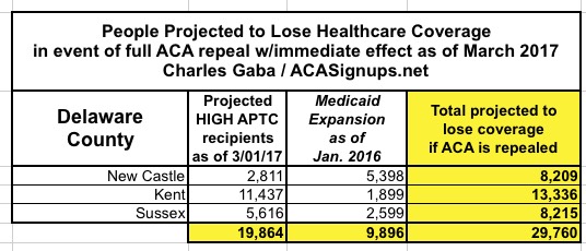 In Delaware, assuming 30,000 people enroll in private exchange policies by the end of January, I estimate around 20,000 of them would be forced off of their private policy upon an immediate-effect full ACA repeal, plus another 10,000 enrolled in the ACA Medicaid expansion program (PPT), for a total of 30,000 residents kicked to the curb.
