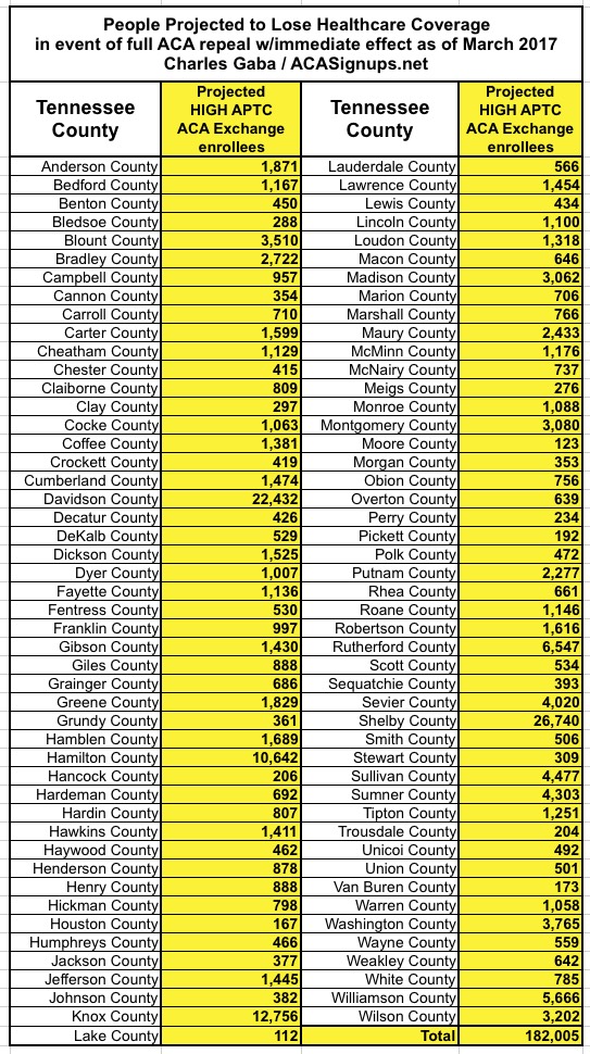In the case of Tennessee, assuming 266,000 people enroll in exchange policies by the end of January, I estimate around 182,000 of them would be forced off of their policy upon an immediate-effect full ACA repeal.