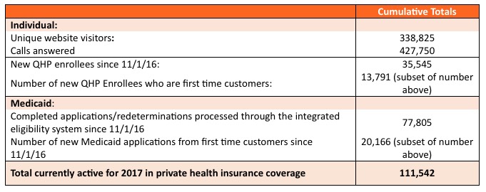 Customer service representatives answered more than 18,000 phone calls and the enrollment centers helped over 200 customers during the final 24 hours of Open Enrollment. The 2017 Open Enrollment numbers are about 4,500 below the 2016 Open Enrollment numbers. It is unclear if this represents an increase in residents insured through other types of healthcare coverage or off-exchange, or an increase in uninsured residents. Connecticut expects to conduct a survey later this year to determine the state’s overall uninsured rate.