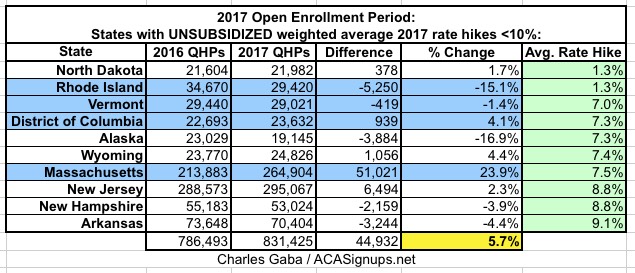 - In the 10 states where unsubsidized premiums only went up modestly (and yes, anything under 10% has been "modest" in the health insurance industry since long before the ACA was passed), enrollments increased by an average of 5.7% over last year (slightly higher once Vermont's final number comes in). Worth noting: 4 of the 10 happen to run their own exchanges.