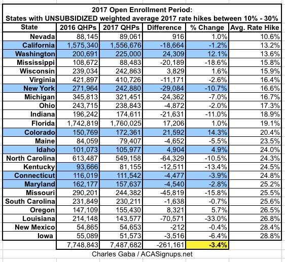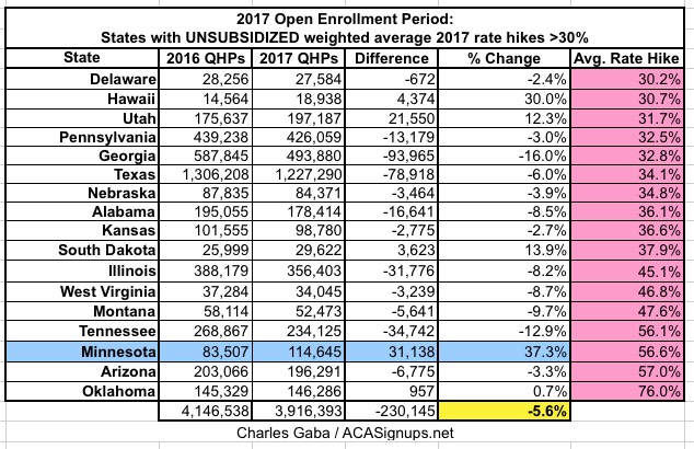 - Finally, in the 17 states where unsubsidized premiums increased by over 30% over 2016, enrollment dropped by 5.6%. (Again: Worth noting that this only includes 1 of the state-based exchanges, Minnesota...which, as it happens, actually increased their enrollment total by a whopping 37% over last year...in large part, I presume due to the last-minute "25% discount" policy enacted by the state legislature, which actually brings MN's average rate hike down to around 17%, meaning it "should" really be included in the 2nd group.)