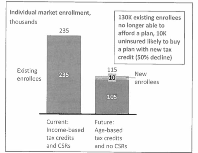 The report estimates that coverage declines would be even higher in states that did not expand Medicaid — largely those run by Republican governors. There, the report presents an example of a state with 235,000 in the individual market. It estimates that coverage would decline by 120,000 people, about 50 percent.