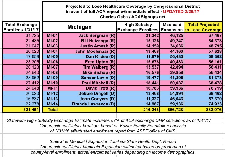 - For instance, Oakland County, Michigan has 53,868 people enrolled in ACA Medicaid Expansion. Oakland County is sliced into 4 separate CDs (MI-08, 09, 11 and 14), so I add 13,467 people into each of those Districts.
