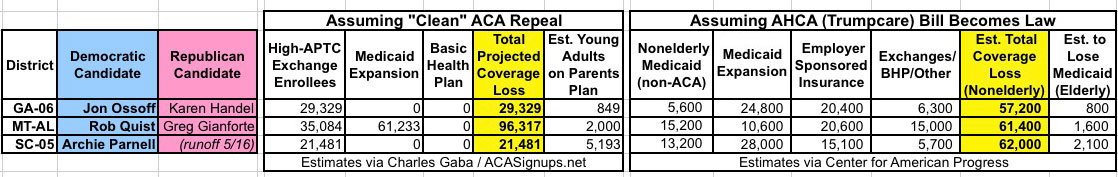 Now that the House has actually voted to pass the AHCA bill, the next order of business are the three special Congressional elections coming up in Georgia, Montana and South Carolina, so I decided to make it easy for activists to focus on the three districts in question: GA-06 (the ultra-high profile race between Democrat Jon Ossoff and Republican Karen Handel); MT-AL (Democrat Rob Quist vs. Republican Greg Gianforte) and SC-05 (Democrat Archie Parnell vs...whoever wins the GOP nomination runoff in mid-May).