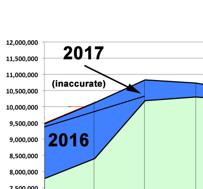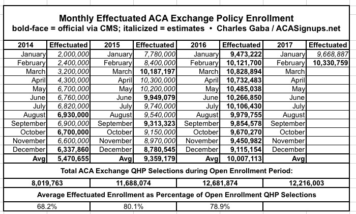 For 2017, of course, we only have 2 months of data so far...but it appears to be starting out slightly better than last year even though the total number of QHP selections was half a million lower. I may have to adjust this as further data/clarification comes in from CMS in the future, but my guess is that when all the March effectuation data is added in, it'll peak at roughly 10.9 million for March, then slide down throughout the year, ending at roughly 9.2 million in December. The monthly average will likely be something like 10.1 million people.