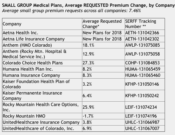 All of the insurance companies have requested premium increases for their plans in the individual market for 2018. For individual plans, the average premium request across all companies is 26.96 percent. In the small group market, the average premium request across all companies is smaller, 7.46 percent. These are averages across all of the plans a company is offering, across all areas of the state where a company offers plans, and for all ages. These do not represent how one person’s premium could change.