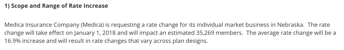 With Blue Cross Blue Shield of Nebraska declining to participate in the Nebraska exchange, that leaves just Medica as the sole individual market carrier. They're asking for a 16.9% average rate hike,