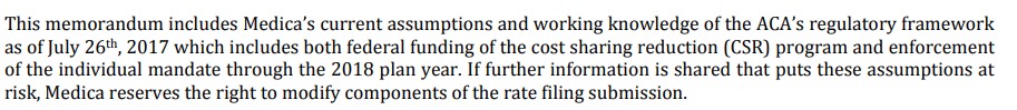 Interestingly, while Medica's rate filing letter clearly states that the 16.9% request assumes CSR payments will be made and the mandate will be enforced, they also list "unprecedented uncertainty/risk inherent in the marketplace" as one of the key drivers of the increase.