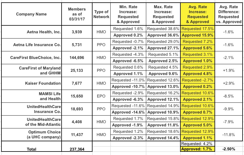 Small Group Market Summary: Approximately 257,000 Marylanders are enrolled in small group plans. The health insurance rates will increase by an average of 1.7% versus the originally filed 4.2%. This single-digit increase can be attributed to favorable experience, a competitive marketplace and two decades of reforms in the State small group market. Four health insurance carriers filed to sell HMO and PPO products in the small group market for 2018: Aetna, CareFirst, Kaiser, and UnitedHealthCare (UHC).