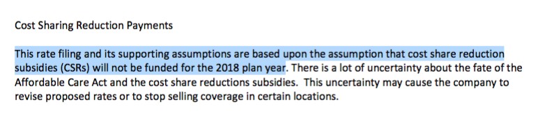 As for the CSR reimbursement issue: Again, only 3 of the carriers would be impacted by this, and one of those (Celtic) is new to the state and therefore has no previous premium average to compare against. This leaves Cigna and Healthy Alliance...both of which explicitly state that their requests assume CSRs will NOT be paid next year. The Kaiser Family Foundation estimates that CSR non-payment will add 18% to Missouri Silver plans, which translates into around 12.2% extra if spread across all policies.
