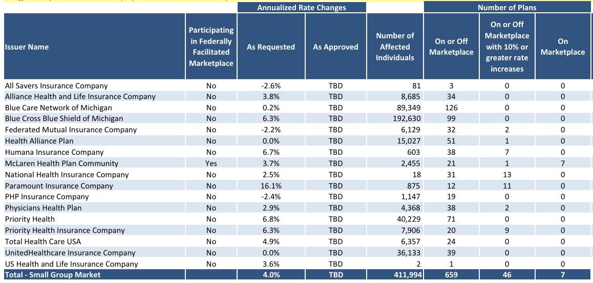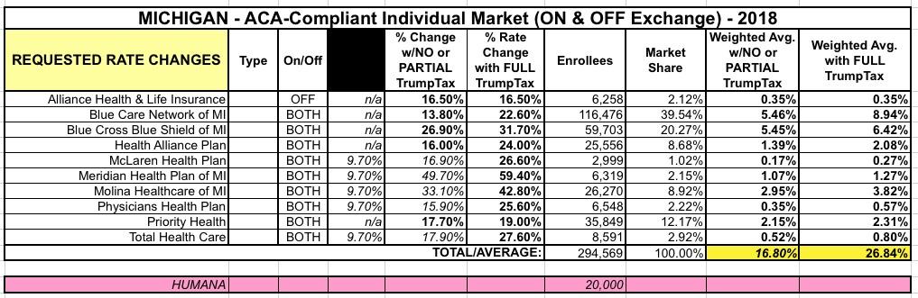 Unlike most states, Michigan's DIFS is courteous enough to provide not only the summary average rate hikes for each carrier, but the number of enrollees impacted by those increases, which are necessary for running a weighted average and are usually a pain to track down: