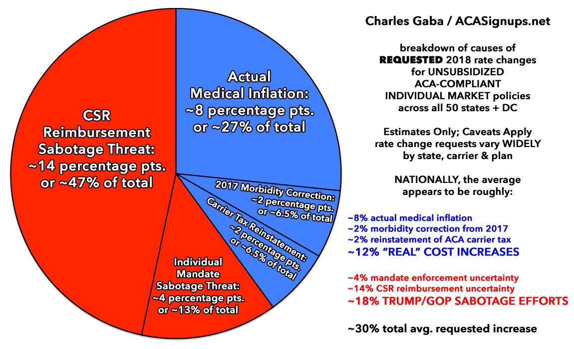 If you assign a 1:1 ratio between unsubsidized rate increases and the number of people expected to lose coverage next year specifically, you could argue that around 800K will be forced to drop coverage due to the "real" rate increases (ie., actual medical inflation, the reinstatement of the carrier tax, etc)...but the other 1.2 million would be due specifically to Trump/GOP sabotage of the CSRs and mandate penalty enforcement. That's not quite how it works, of course, but it gives a rough idea of how much of an impact those factors are.