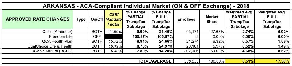 Now that we've passed the 9/27 contract signing deadline for 2018 carrier participation on the ACA exchanges, the state insurance departments are posting their approved final rates pretty quickly. Arkansas has done a fantastic job of clearly laying out not just what the rate changes will be, but is explicitly stating how much of those increases are due to the GOP's refusal to formally appropriate CSR reimbursement payments next year: