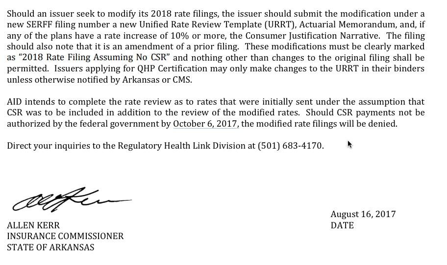 The bulletin in question states that the Arkansas Insurance Commissioner hopes to use the lower rate filings (which assume CSRs will be paid), but if they don't receive formal appropriation by October 6th, they're gonna have to use the "no CSR" rates, which are an additional 9 percentage points higher: