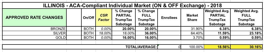The Illinois DOI doesn't appear to have posted approved average rate hikes or enrollment numbers for the individual carriers, but they've done something almost as good (and in some ways more useful): Their rate/plan analysis PDF lists the average rate increases for all individual market policies by metal level. Since I already know what portion of the indy market is enrolled in Bronze, Silver and Gold (there aren't any Platinum plans available in IL), this allows me to not only put together the overall average increase, but also clearly shows the impact of loading CSRs onto Silver plans only (around 18 points, or exactly half of the overall Silver increase). This gives a weighted statewide average increase of 30.2% assuming CSRs won't be paid...which would only be about 18.6% if the plans had been priced to assume they will be paid: