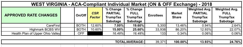 Furthermore, a trusted ACA Navigator friend confirms that in a conference call re. WV rates, Highmark and Carefirst stated that their rate increases would only be 15% and 7% respectively without the CSR factor, which is very close to what I was estimating earlier anyway.