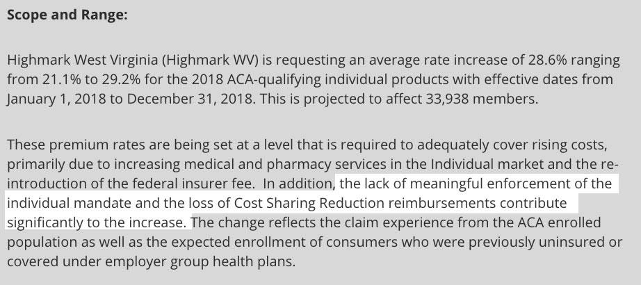 The problem is that this has little to do with the rate increases for next year; Highmark specifically called out both the CSR and mandate enforcement sabotage factors in their filings: