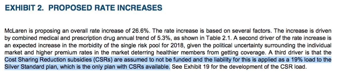 As in most states, the Michigan Dept. of Financial Services, seeing the potential writing on the wall, sent out a memo to all individual market insurance carriers instructing them to submit two different sets of rate filings for 2018: One assuming CSR payments would continue, the other assuming they won't:
