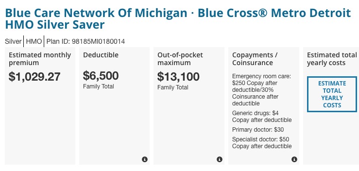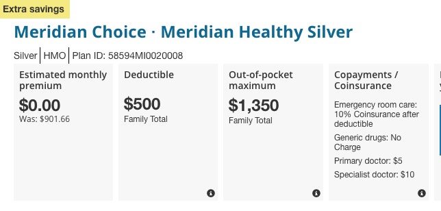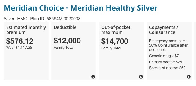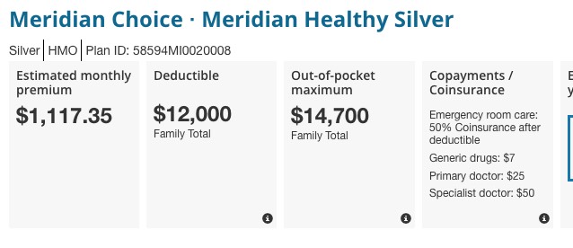 Here's what that does for this family next year. The "Meridian Choice" plan is no longer the benchmark Silver; the price for that plan has increased by $91/month...but the new Benchmark Silver, BCN's "Blue Cross Detroit Silver Saver", only costs $488/month...just a couple dollars more than the Meridian does this year. In addition, the deductible on the new benchmark plan is $4,300 lower than the Meridian plan is this year. this family would probably be better off switching to it, assuming their doctors/hospitals are still in network: