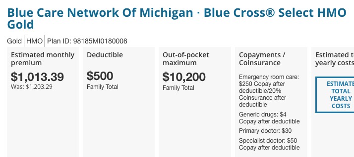 If they chose the Gold BCN HMO, they're paying $1,013/month with the $500 deductible after the tax credits are applied.
