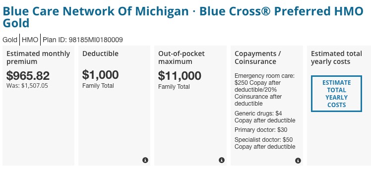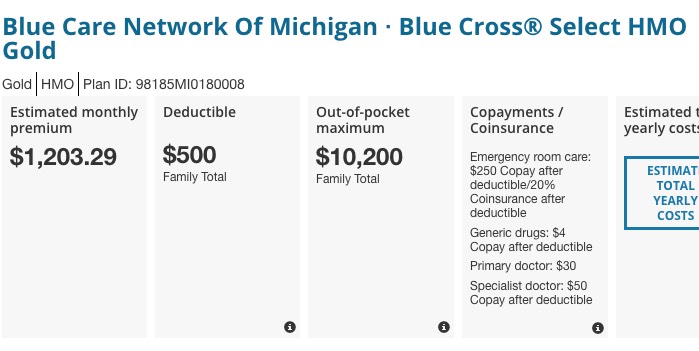 How about the BCN Gold HMO, however? Again, the slightly different plan has a $500 higher decuctible...but the premiums have gone down by $47/month, or $564/year. This is basically a wash year over year.