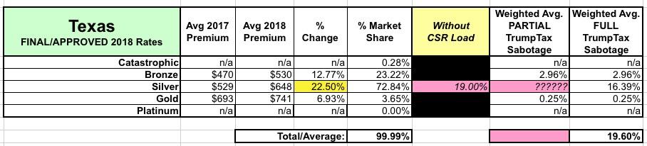 Um...no. That doesn't work at all. Aside from the fact that I guarantee you Silver plans would not have dropped by 3% if Texas CSRs were paid (especially not when Bronze and Gold are going up), notice that even the CSR load average is only 19.6%...that's even lower than I estimated the no CSR load this summer.
