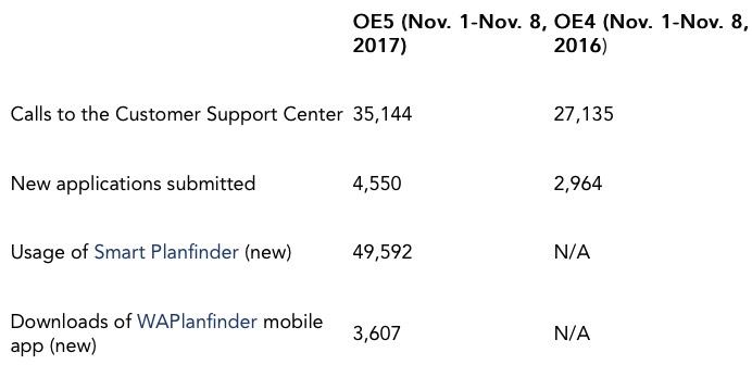 “We are very pleased to see this level of interest so early in open enrollment,” said Pam MacEwan, CEO of the Washington Health Benefit Exchange. “As with every new plan year, people need to review their health insurance options, and Washington Healthplanfinder is the most trusted place for Washingtonians to shop for and compare available plans. Many of our customers will qualify for tax credits that can lower the cost of coverage.”