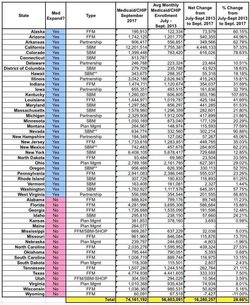Anyway, here's a simplified version of the table breaking out all 74.2 million enrollees by state: