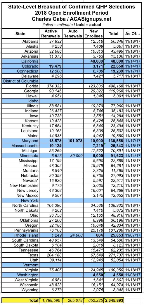 Again, here's the confirmed enrollments to date, broken out by state, type and thru-date: 2.65 million nationally, with at least 2.0 million renewing enrollees and 650,000 new additions known to date. I actually suspect the total is closer to 4.0 million given all the missing data, but these are official.