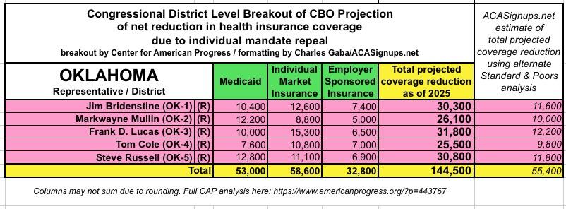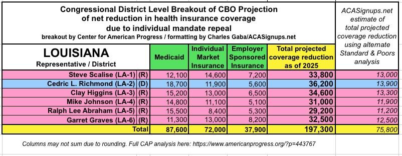 One more thing, however: In addition to the Congressional Budget Office projections, I've also included my own CD-level breakout of the lower coverage loss projections estimated by Standard & Poors. Unlike the CBO's 13 million projection, S&P estimates that only around 5 million people at most would lose coverage over the next several years if the ACA's individual mandate were to be repealed (without other significant changes to the law).