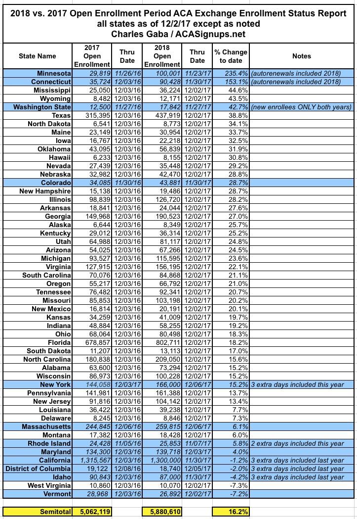 UPDATE 12/7/17: Small update out of New York: 166K QHPs thru 12/06