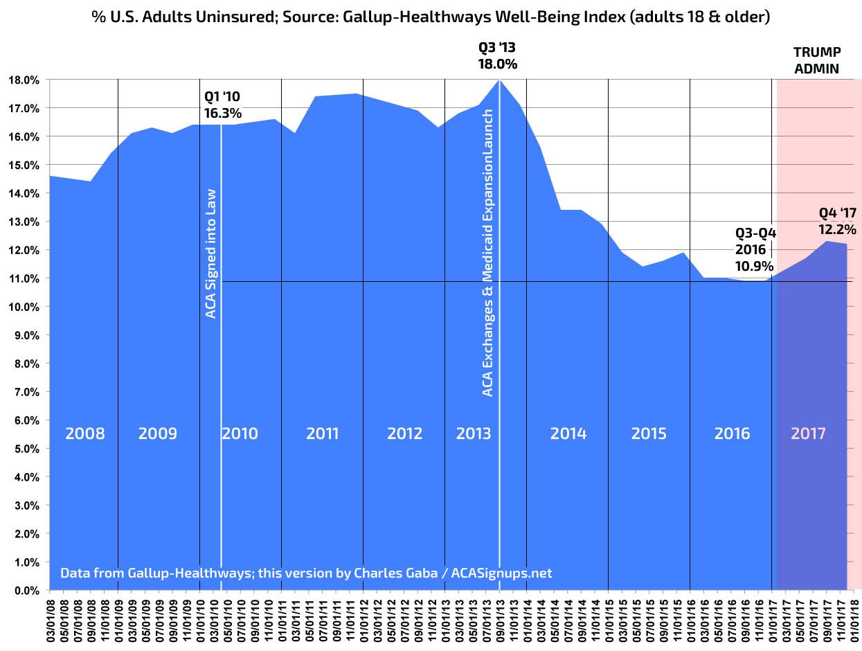 Every quarter, Gallup posts the results of an exhaustive healthcare coverage survey (with over 25,000 U.S. adults). They just posted the latest update, which covers the fourth quarter of 2017, and the results are...striking.