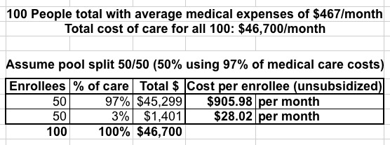 Let's say that you have 100 people currently using an average of $467/month in healthcare services (for the moment, I'm ignoring profit margins and the like). That's a total of $46,700 per month for all 100 people.