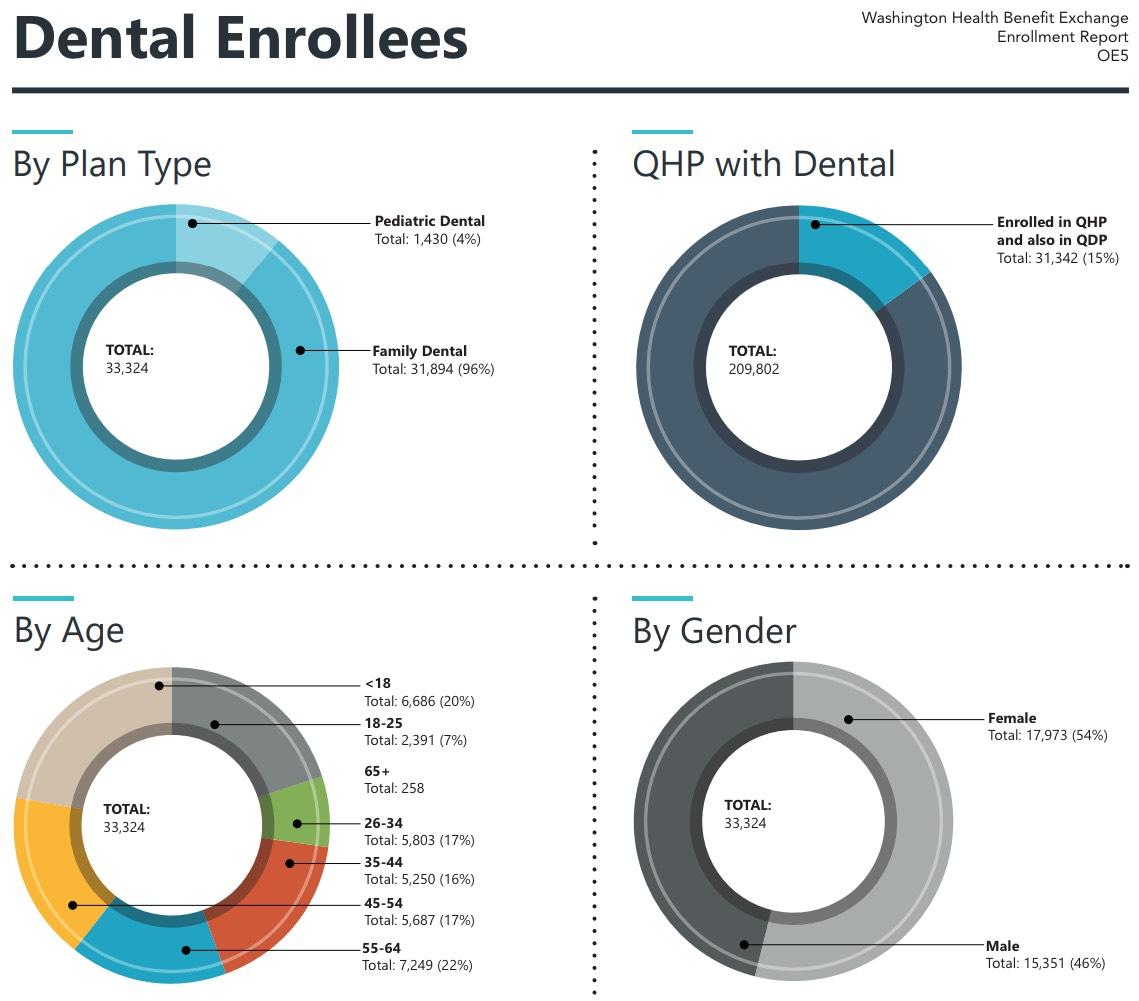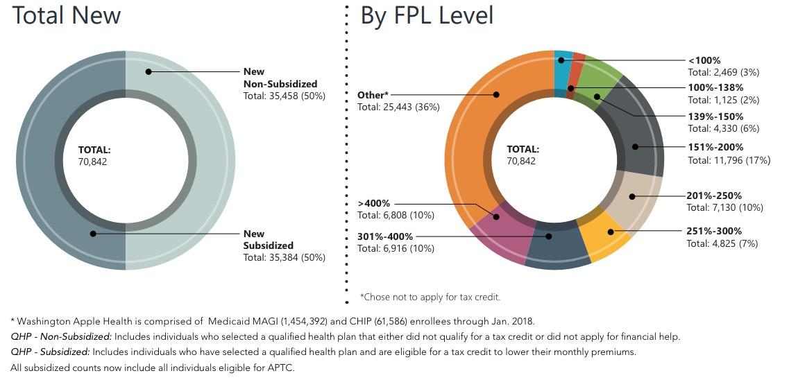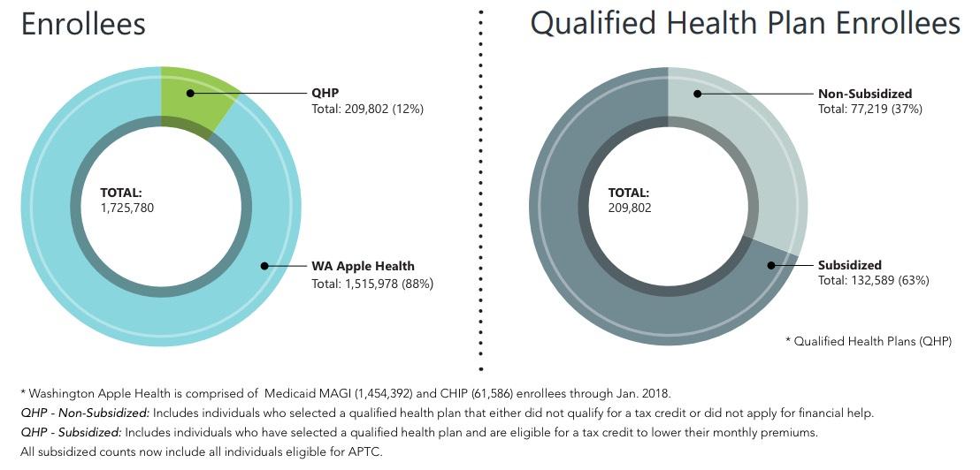 This enrollment announcement is provided in more detail in the most recent Open Enrollment Report released by the Exchange. The report offers a comprehensive look at the more than 1.72 million Washington Healthplanfinder customers who are enrolled in health and dental coverage as of Feb. 2018, including the 1.5 million residents currently enrolled in free coverage through Washington Apple Health (Medicaid MAGI/CHIP).