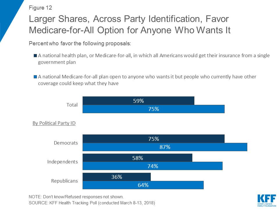 Support for such a proposal increases when framed as an option for anyone who wants it; three-fourths of the public favor a national Medicare-for-all plan open to anyone who wants it, but would allow people who currently have other forms of coverage to keep the coverage they already have.